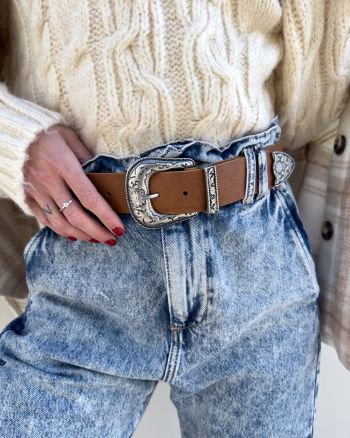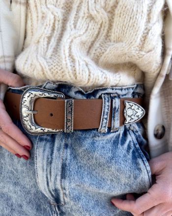 Luxe leather belt for women, rock style, with a metal belt buckle.