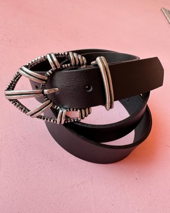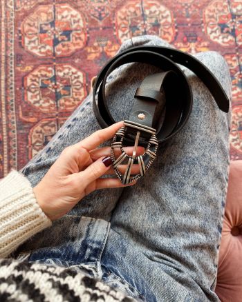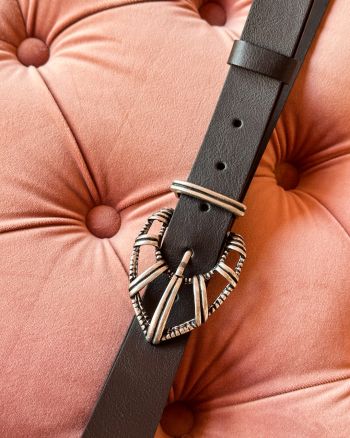 Luxe leather belt for women, boho style, with a metal belt buckle in an angle design.