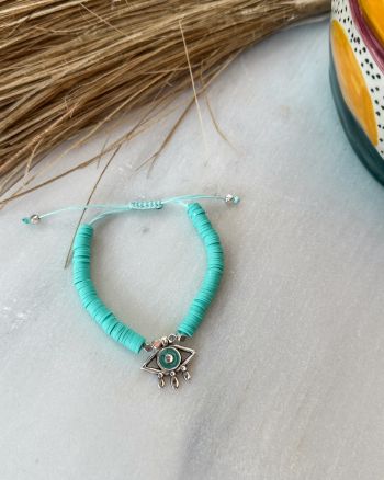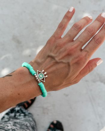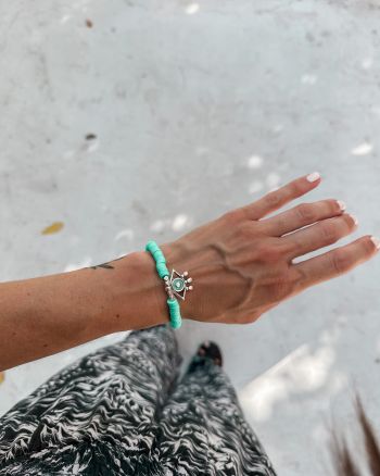 Need a beachy new bracelet? Our Acqua bracelet is the perfect piece for all you summer girls! With its turquoise colour and a boho evil eye charm, it will complete your seaside style.