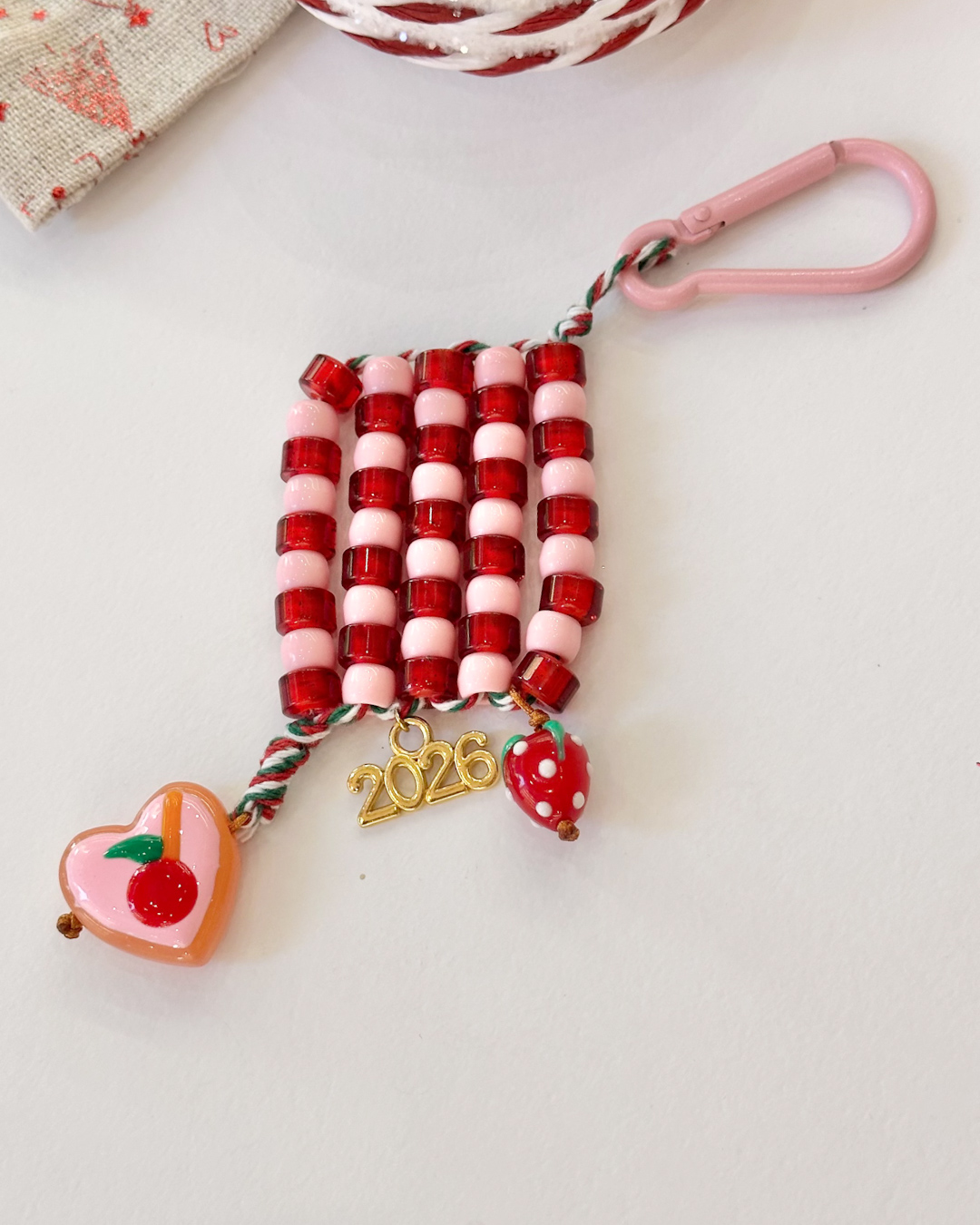 The sweetest lucky charm for 2026! This handmade candy-inspired keychain features a vibrant mix of pink and red beads,paired with adorable heart, cherry and '2026' metal accents. Easy to clip on, this accessory adds a playfull touch to any bag, key set or wallet.