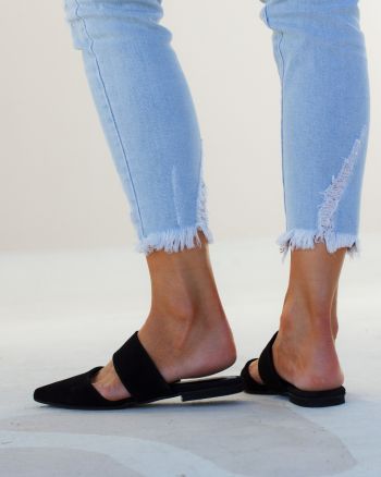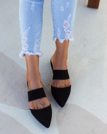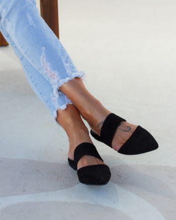 Black colored leather mules with a nice slender strap. A pointy-toe mule crafted from smooth suede leather and finished with a cushy footbed. Such a unique and lovely design that every woman will adore. These suede mules are the perfect shoes for every day at work or your every day walks.