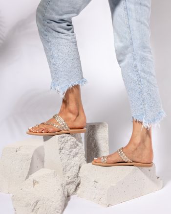 Chrysi, flat leather sandals with gold braided design.