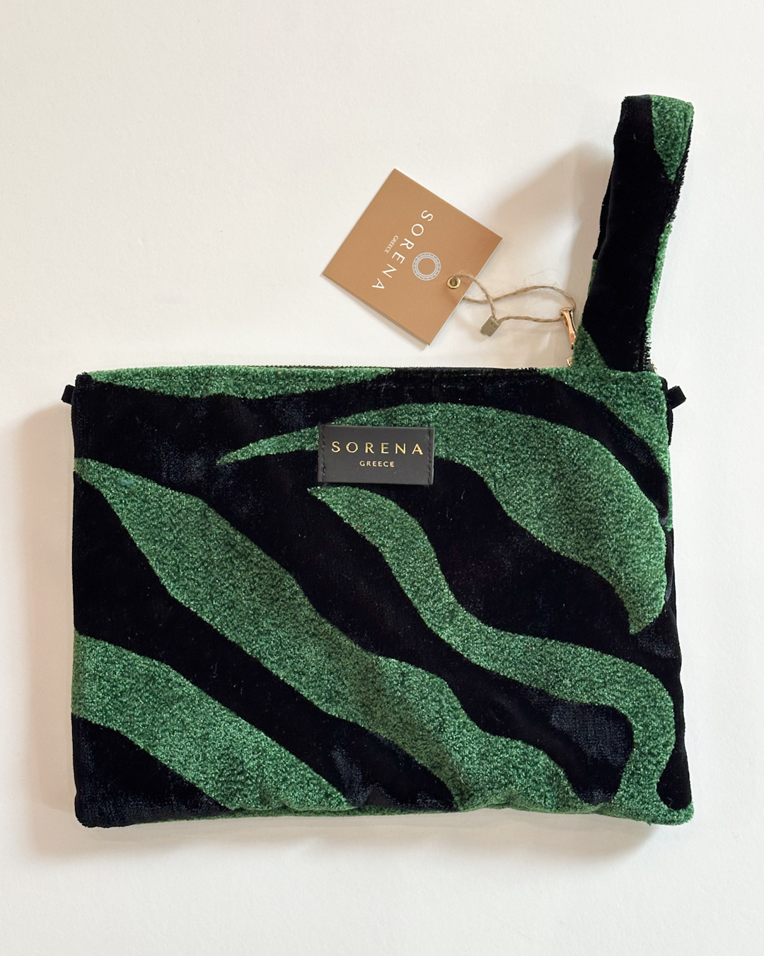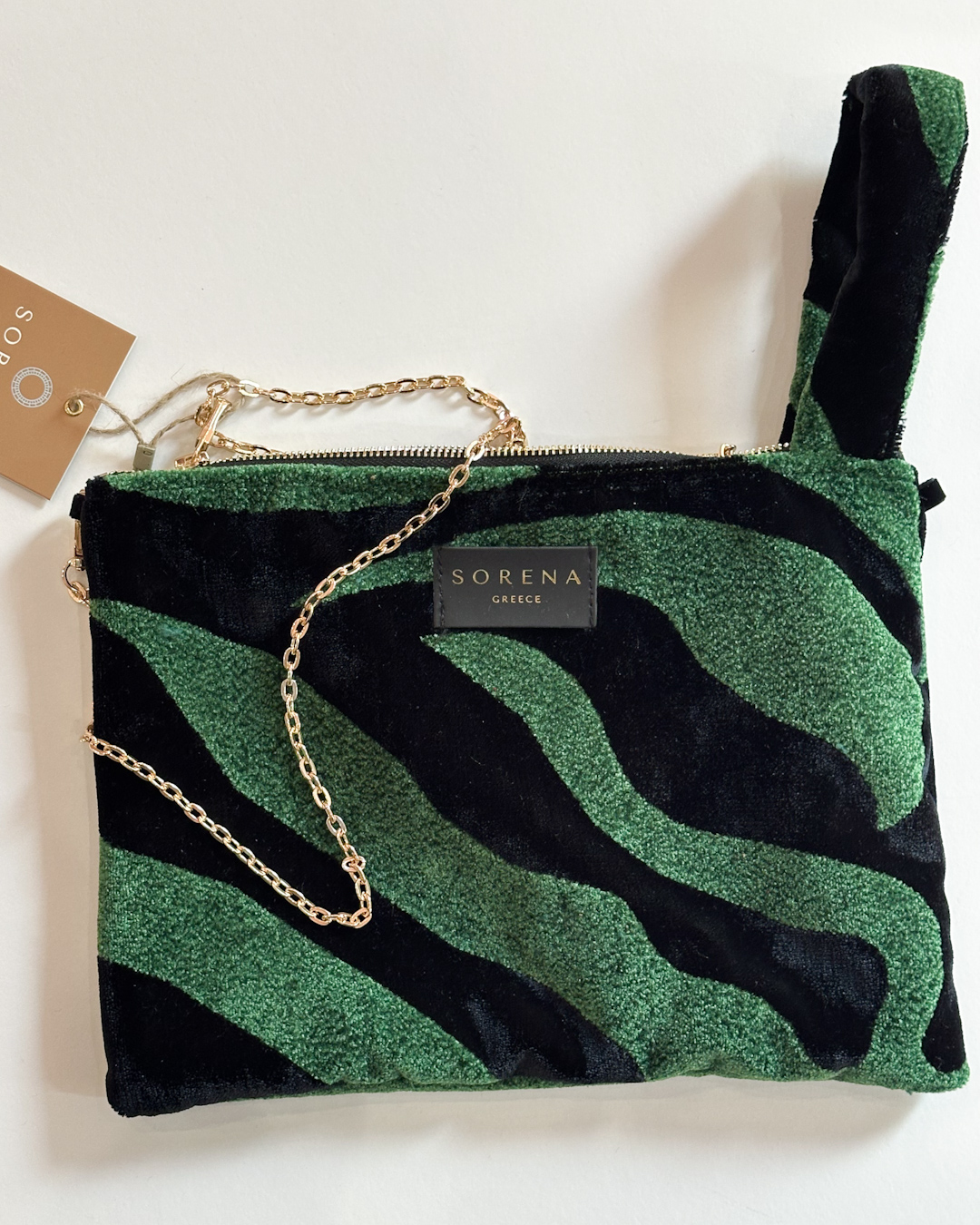 Χειροποίητο τσαντάκι της αγαπημένης μας εταιρείας Sorena φτιαγμένο από μοναδικό βελούδινο ύφασμα. Κατάλληλο για χρήση από το πρωί εώς το βράδυ είτε κρατώντας το στο χέρι, κρεμασμένο στον καρπό ή στον ώμο καθώς διαθέτει και αποσπώμενο αλυσιδάκι!