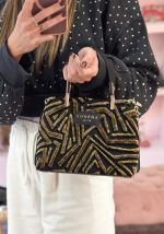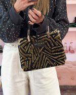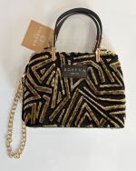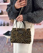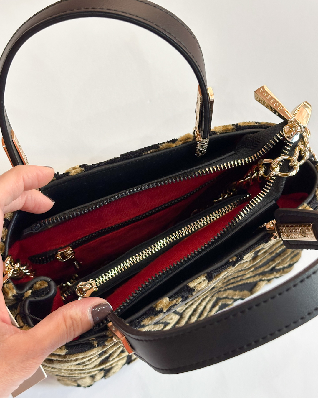 Η τσάντα είναι φταγμένη από εξαιρετικό ύφασμα με απαλή βελούδινη υφή. Το έντονο γεωμετρικό της μοτίβο, αποπνέει δυναμισό και αυτοπεποίθηση. Η χαρακτηριστική σιλουέτα της Sorena προσδίδει την τέλεια πινελιά κομψότητας στην κάθε σας εμφάνιση.