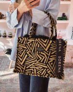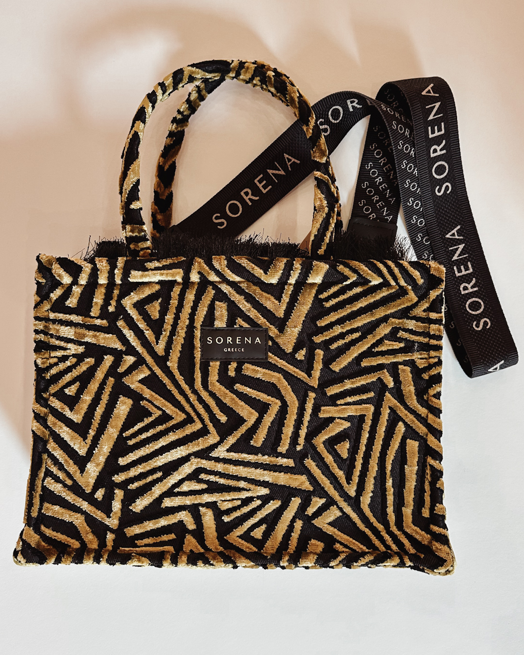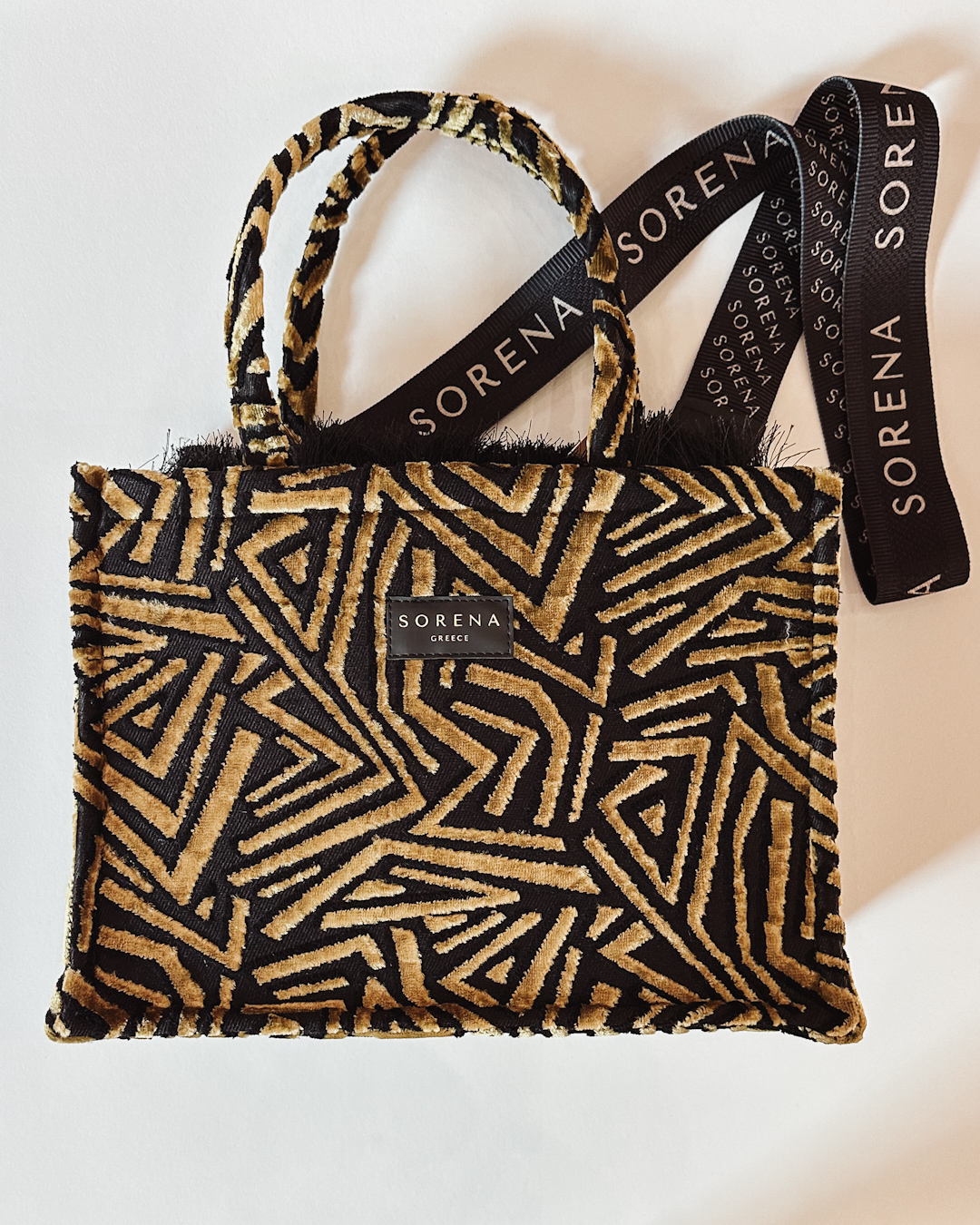 Η τσάντα είναι φταγμένη από εξαιρετικό ύφασμα με απαλή βελούδινη υφή. Το έντονο γεωμετρικό της μοτίβο, αποπνέει δυναμισό και αυτοπεποίθηση. Η χαρακτηριστική σιλουέτα της Sorena προσδίδει την τέλεια πινελιά κομψότητας στην κάθε σας εμφάνιση. Ιδανικά ευρύχωρη για να έχετε μαζί σας ό,τι χρειάζεστε με άνεση και στυλ!