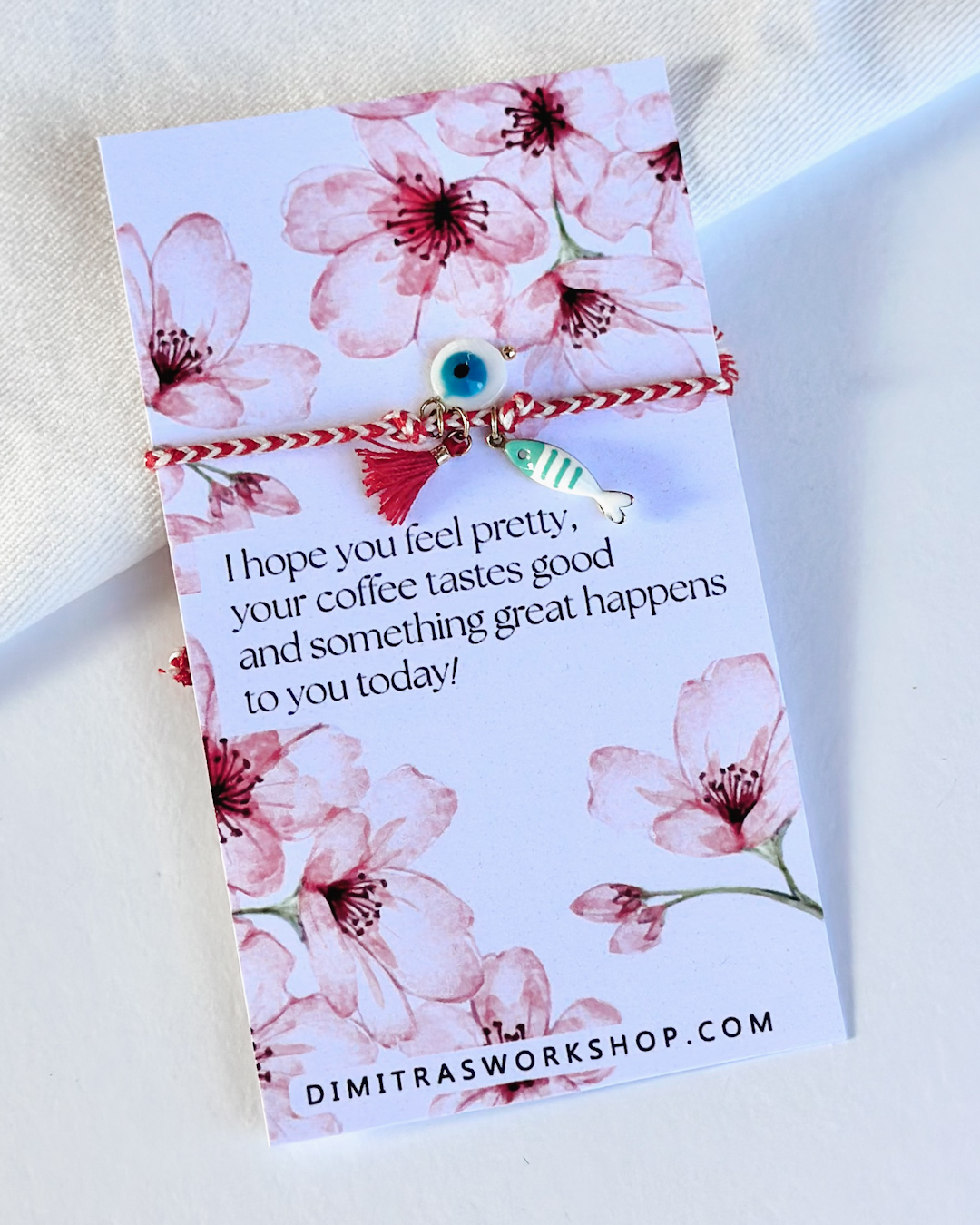 Μαρτάκι με κόκκινο και λευκό κορδόνι και μακραμέ κλείσιμο για εύκολη αυξομείωση, διακοσμημένο με ένα μικρό στοιχείο μάτι, ψαράκι και φουντάκι κόκκινο. Σύμβολο χαράς, δημιουργίας και ανθισμένης άνοιξης. Φοριέται άνετα μόνο του ή σε layering και είναι ιδανικό για δώρο, ως μια μικρή ανοιξιάτικη χειρονομία με νόημα. Συνοδεύεται από κάρτα με ανοιξιάτικο θέμα και όμορφα λόγια, έτοιμο να το χαρίσεις στους αγαπημένους σου.
