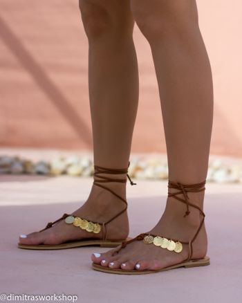 Τα σανδάλια Soleil είναι ακριβώς αυτό που σκεφτόμαστε όταν λέμε boho chic εμφάνιση. Ιδανικά για κάθε μέρα, αυτά τα δερμάτινα σανδάλια διαθέτουν t strap στιλ και δένουν στον αστράγαλο με δερμάτινα κορδόνια. Όλο το μπροστινό μέρος του σανδαλιού είναι διακοσμημένο με φωτεινά χρυσά νομίσματα. Αν έχετε ακούσει για τα καλοκαιρινά ελληνικά ηλιοβασιλέματα τότε μπορείτε να μαντέψετε από πού εμπνέονται αυτά τα σανδάλια!