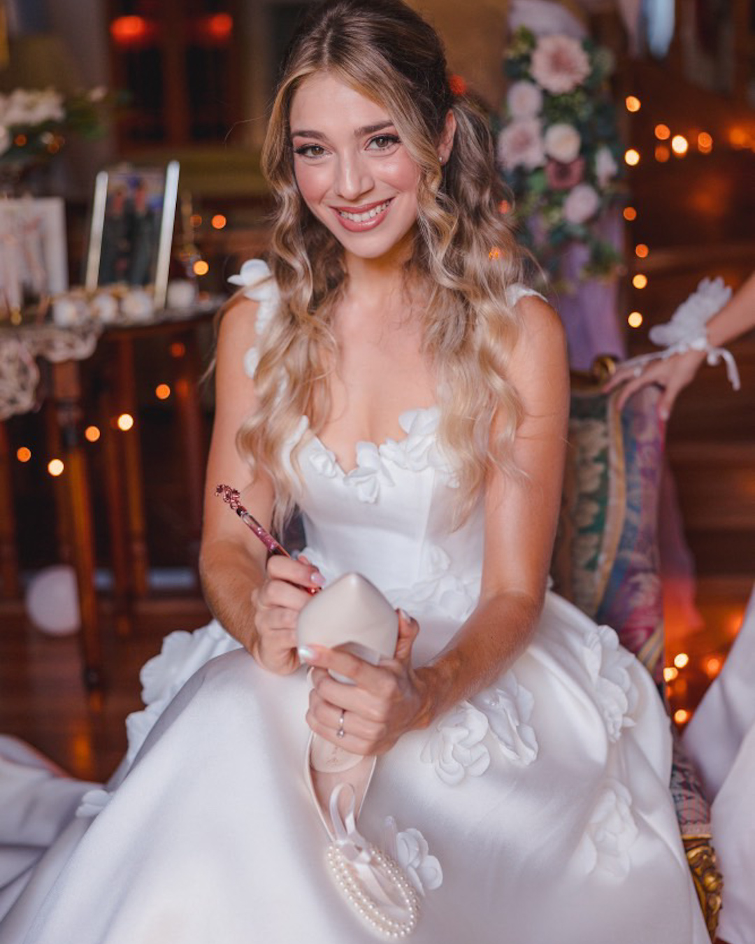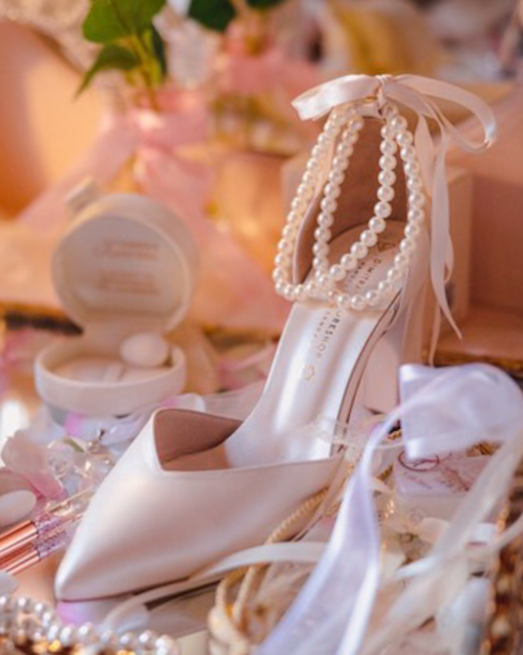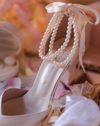 Κομψή μυτερή νυφική γόβα σε σχήμα V, κλειστή φτέρνα και λουράκι στον αστράγαλο για σταθερή εφαρμογή. Πέρλες που δένουν πίσω με κορδέλα για ρομαντική λάμψη. Χειροποίητη στην Ελλάδα.