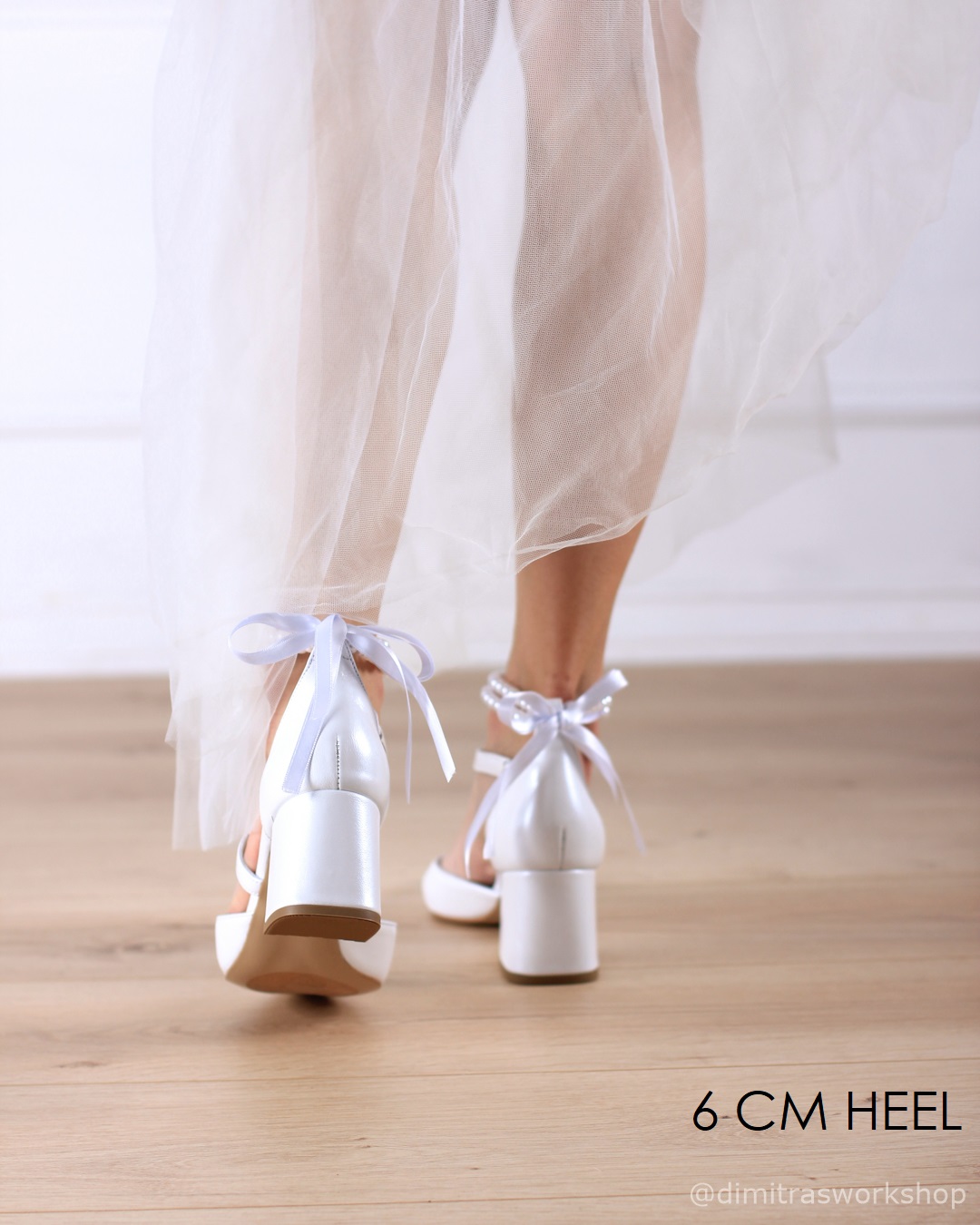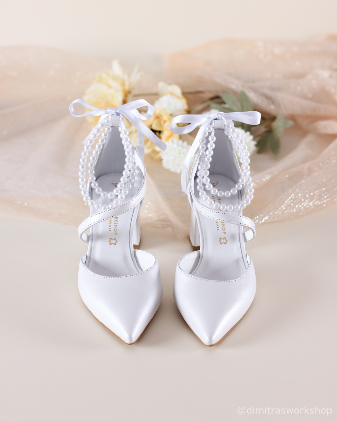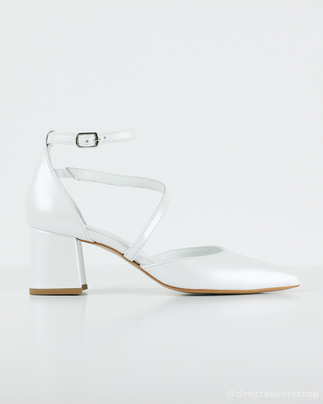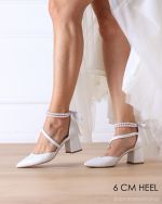 Αυτές είναι οι κομψές νέες γόβες μας, Audrey! Είναι μια κλασική δερμάτινη γόβα με μύτη, σε χρώμα λευκό περλέ. Διαθέτουν διαγώνιο λουράκι και τακούνι 8 εκατοστών κάτι που κάνει τις γόβες μας πολύ σταθερές. Προσθέστε κομψότητα, θηλυκότητα και ρομαντισμό στα βήματά σας όχι μόνο στην ιδιαίτερη ημέρα σας, καθώς αυτές οι γόβες μπορούν να φορεθούν ξανά και ξανά μετά την ημέρα του γάμου σας σε άλλες επίσημες περιστάσεις! Πώς να μην τις αγαπήσετε;