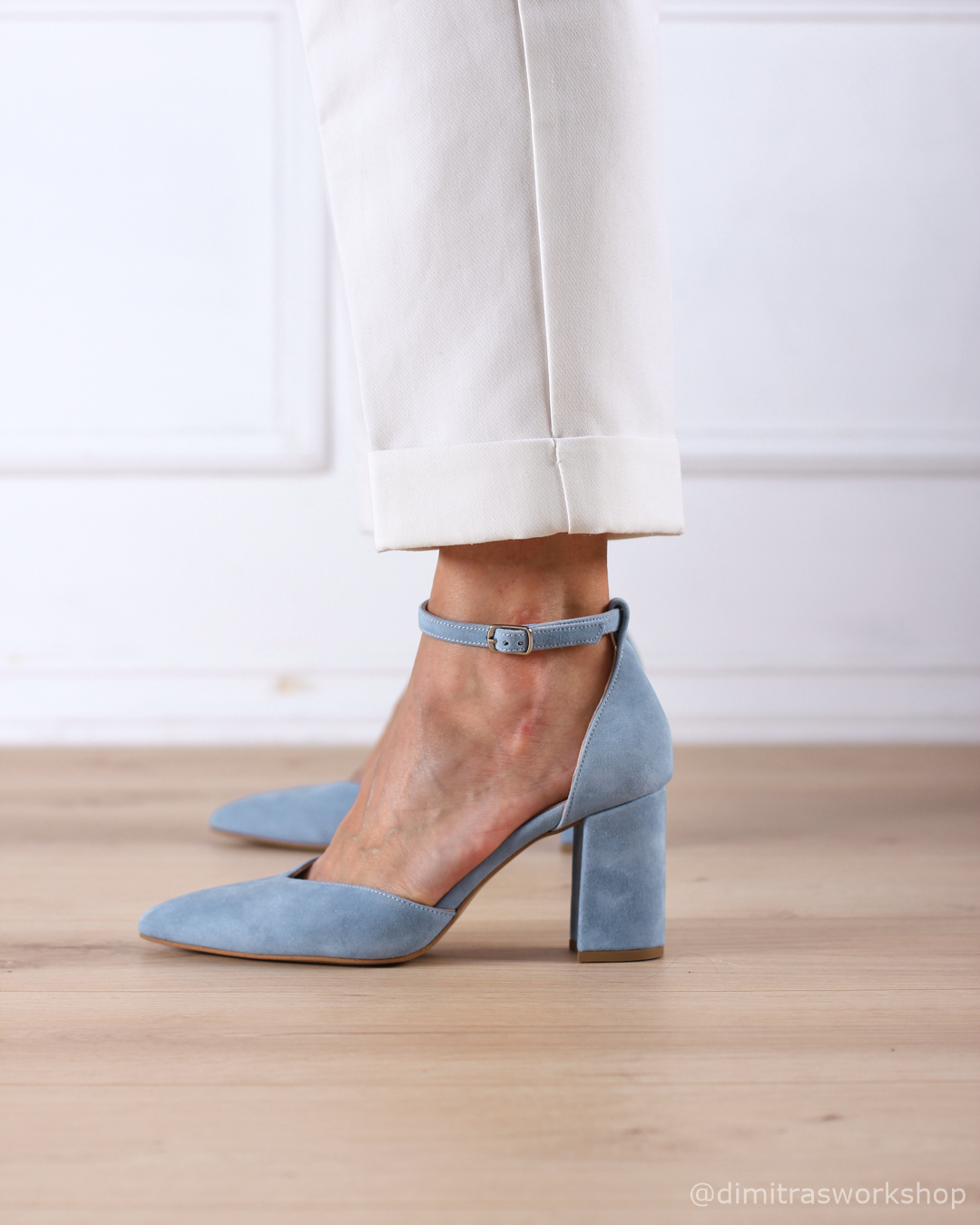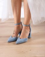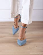 Celeste είναι μια γαλάζια σουέντ γόβα που συνδυάζει κομψότητα με άνεση, ιδανική για εμφανίσεις που θέλουν στιλ αλλά και σιγουριά στο περπάτημα. Το μυτερό της σχήμα με άνοιγμα σε σχήμα V κολακεύει το πόδι και “λεπταίνει” οπτικά τη γραμμή, ενώ η κλειστή φτέρνα προσφέρει σταθερότητα. Το λουράκι στον αστράγαλο κρατά το πόδι ασφαλές και δίνει έξτρα στήριξη, ώστε να την ευχαριστηθείτε άνετα από την τελετή μέχρι το γλέντι.