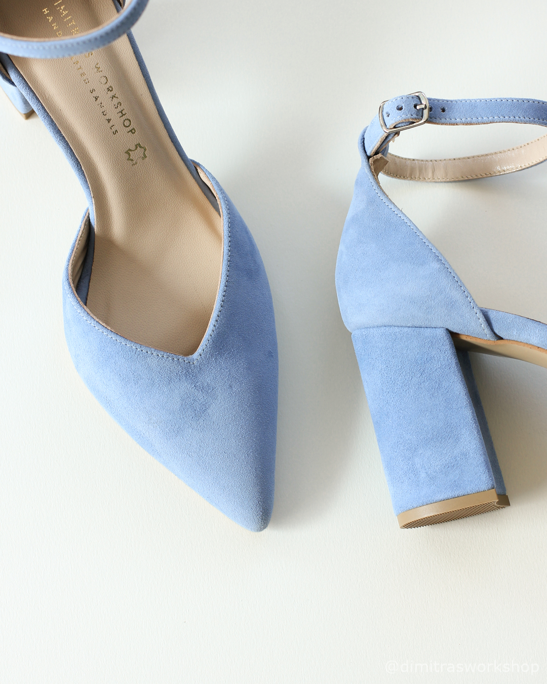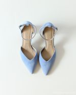Celeste γαλάζια καστόρι γόβα μυτερή με άνοιγμα σε σχήμα V, κλειστή φτέρνα και λουράκι αστραγάλου — ιδανική για γάμο, βάπτιση αγοριού, νονά ή μαμά και νύφη.