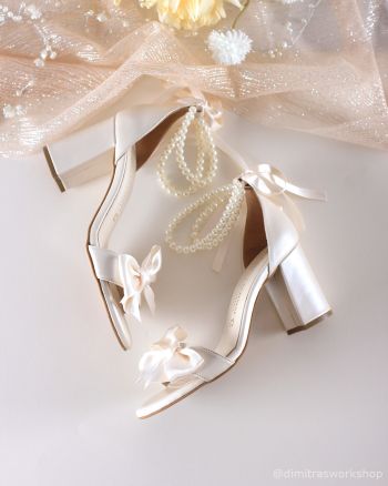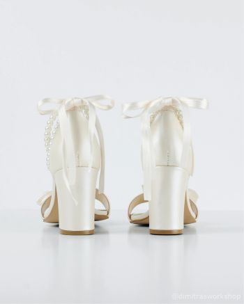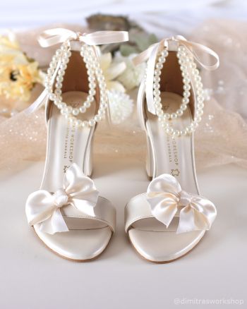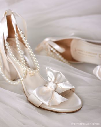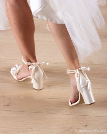 Νυφικό πέδιλο από ιβουάρ δέρμα με σταθερό χοντρό τακούνι και κλειστή φτέρνα για σίγουρη εφαρμογή και άνεση για όλη την μέρα του γάμου. Διακοσμείται με φιόγκο στο μπροστινό μέρος και πέρλες στον αστράγαλο.