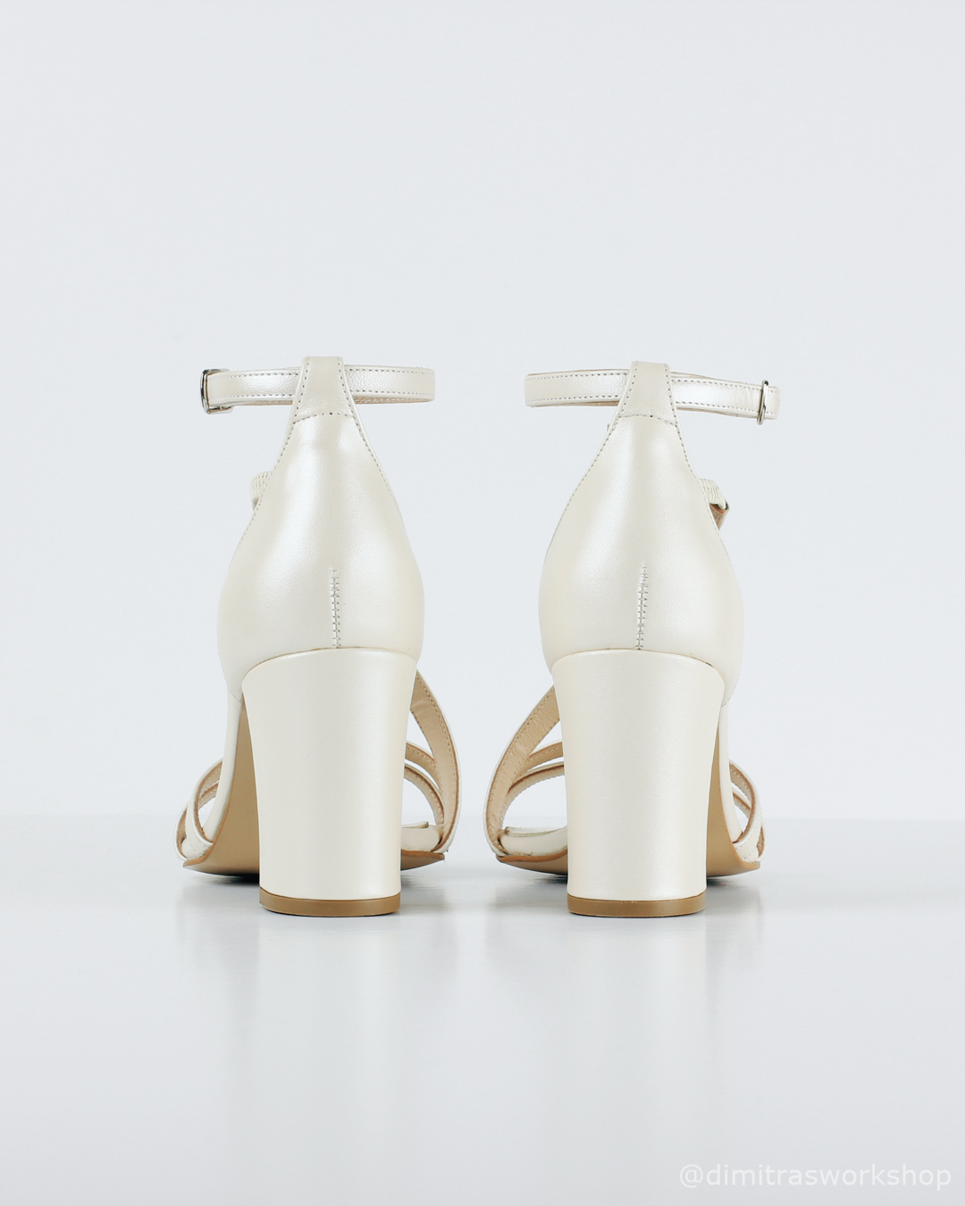 Το Diana είναι ένα νυφικό πέδιλο από ιβουάρ δέρμα, σχεδιασμένο για άνεση και σταθερότητα χωρίς να χάνει σε κομψότητα. Το χοντρό, σταθερό τακούνι προσφέρει σίγουρο πάτημα, ενώ τα πολλά λουράκια αγκαλιάζουν το πόδι και βοηθούν να παραμένει η εφαρμογή ασφαλής από την τελετή μέχρι το πάρτι.