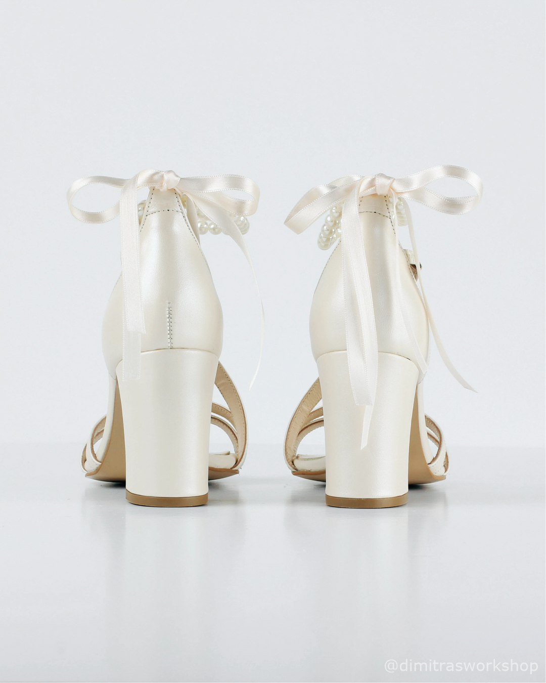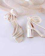 Ιβουάρ δερμάτινο νυφικό πέδιλο με λεπτά λουράκια και πέρλες στον αστράγαλο που δένουν πίσω με κορδέλα. Σταθερό τακούνι 8 εκ. και μαλακή σόλα για κομψότητα και άνεση όλη μέρα.